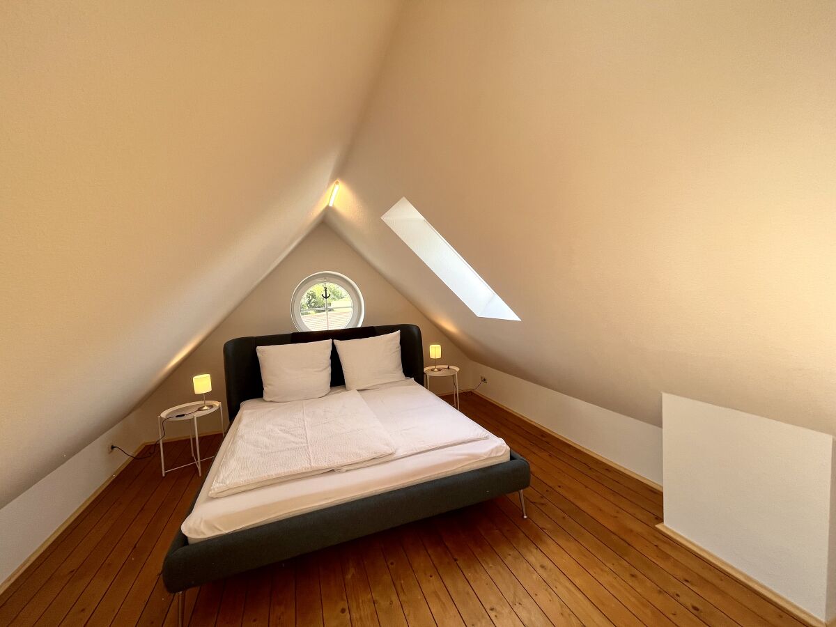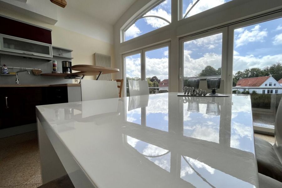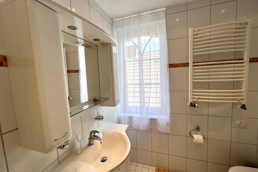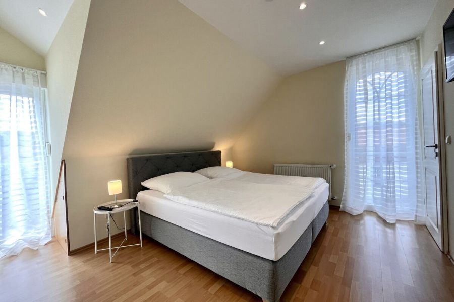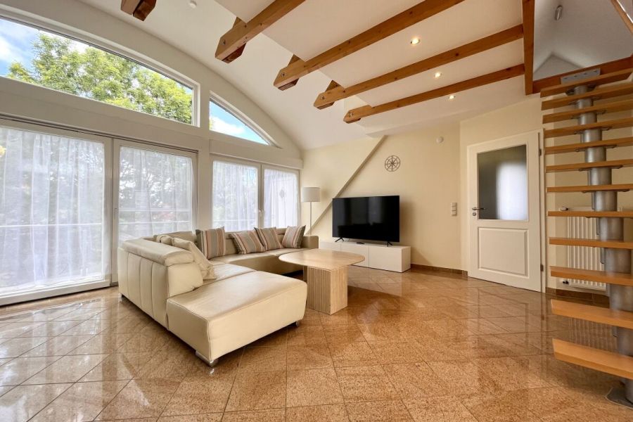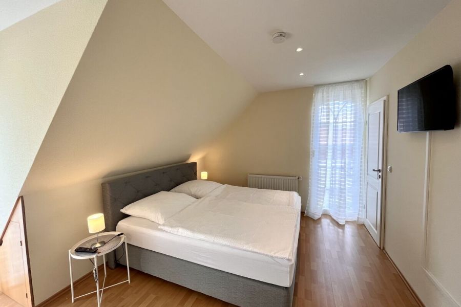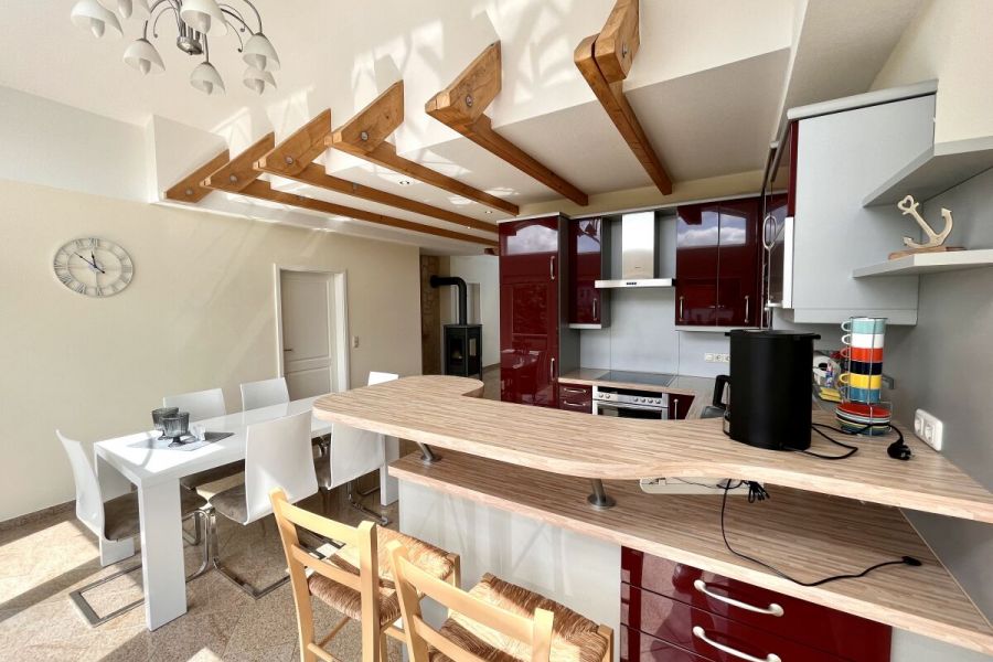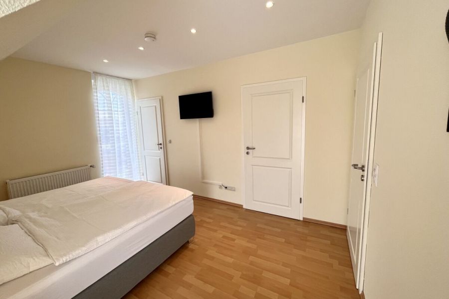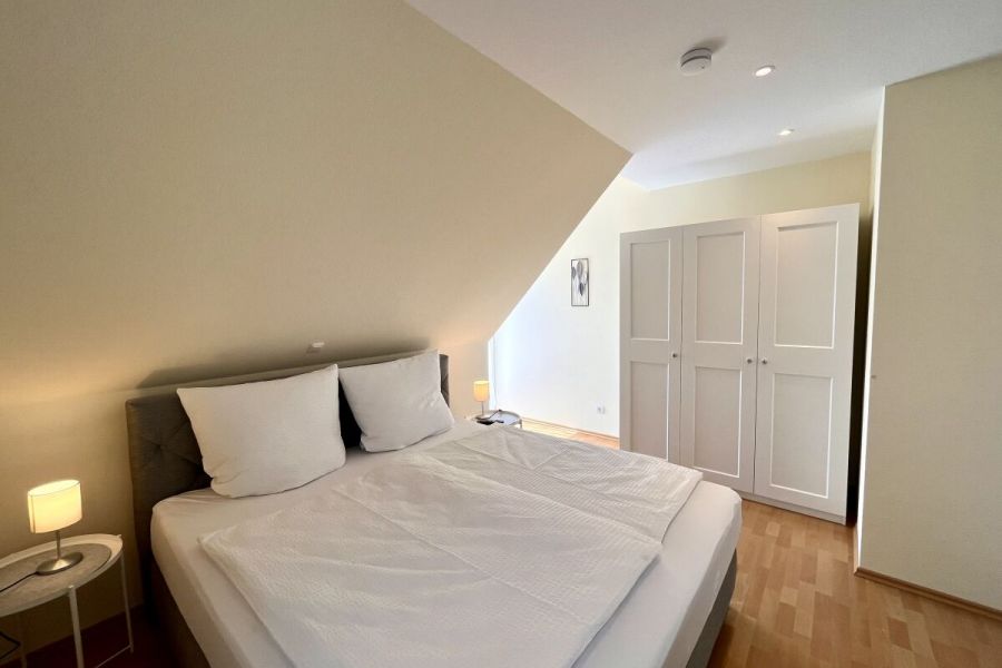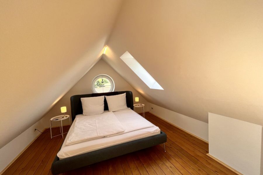 Die Wohnung ist in 2022 komplett neu renoviert worden und beherbergt in der ersten Etage, zwei Schlafzimmer. Diese sind jeweils mit einem großen Boxspringbett und einem TV- Gerät ausgestattet. Besonders hervorhebend ist hier, dass eines der zwei Schlafzimmer, ein eigenes Badezimmer mit Wellnessdusche und einem begehbaren Kleiderschrank verfügt. Von beiden Schlafzimmern aus, gelangen Sie auf den Balkon, der Ihnen einen einzigartigen Blick, auf den Hafen von Carolinensiel bietet. Für das Mobile Arbeiten im Urlaub oder dem Besuch der ganzen Familie, steht ein Büro und ein zweites Badezimmer mit Dusche, zur Verfügung. Das Schmuckstück der Wohnung, ist der Wohn- und Essbereich, mit offener Küche. Hier können Sie sich bei angestellter Fußbodenheizung oder am schönem Kaminofen, entspannen. Die Küche ist mit einer Spülmaschine, einer Mikrowelle und allem weiteren Utensilien eingerichtet, was man zur Bewältigung des Alltages benötigt. Vom Wohnbereich, der natürlich auch mit einem großen TV-Gerät ausgestattet ist, gelangen Sie auf den zweiten Balkon, der den Blick auf den Hinterhof des Hauses bietet. Der ausgebaute Spitzboden bietet Ihnen einen kleinen Ruhebereich mit bequemen Möbeln und ein Boxspringbett für zwei weitere Personen.