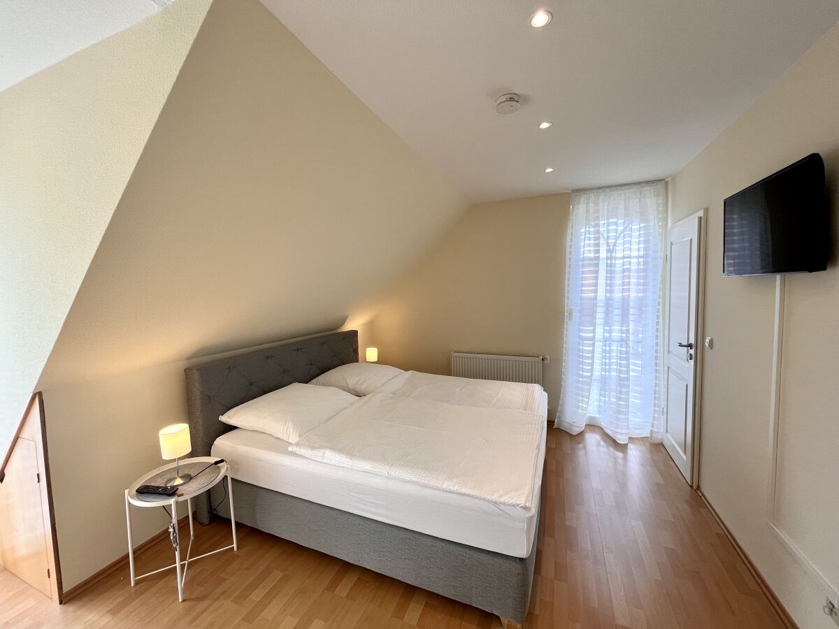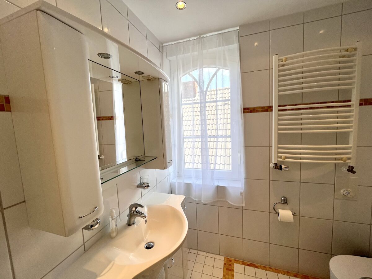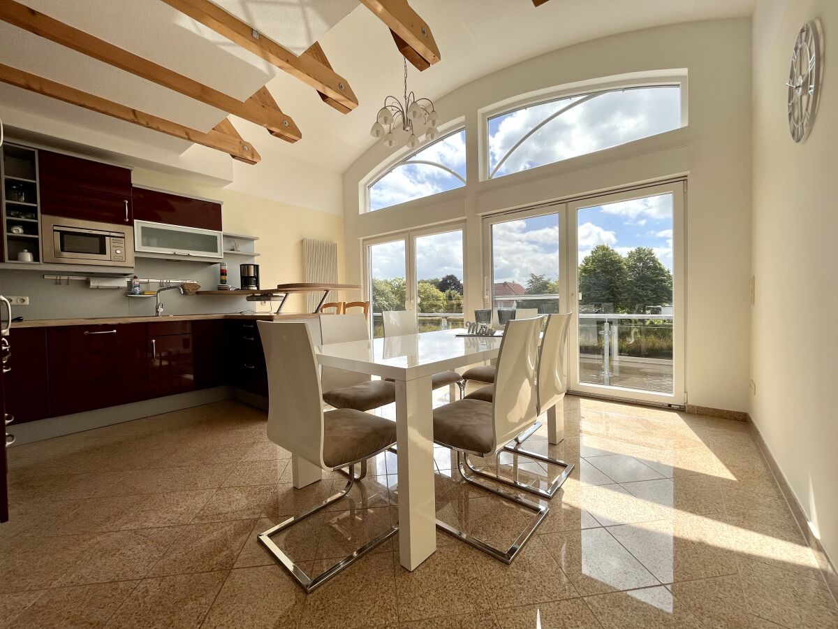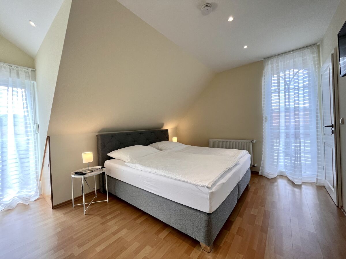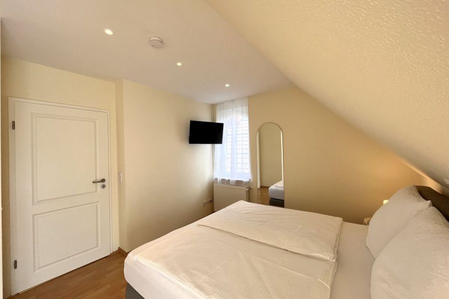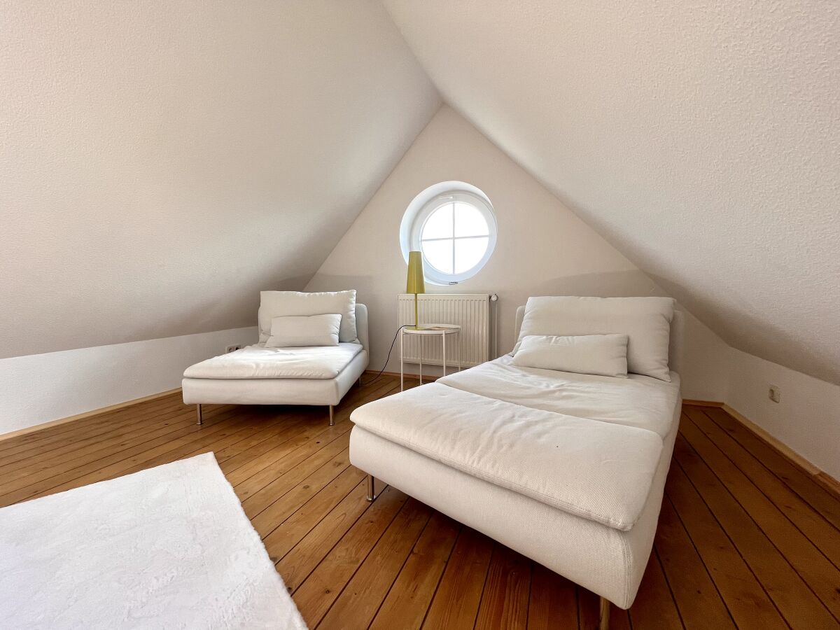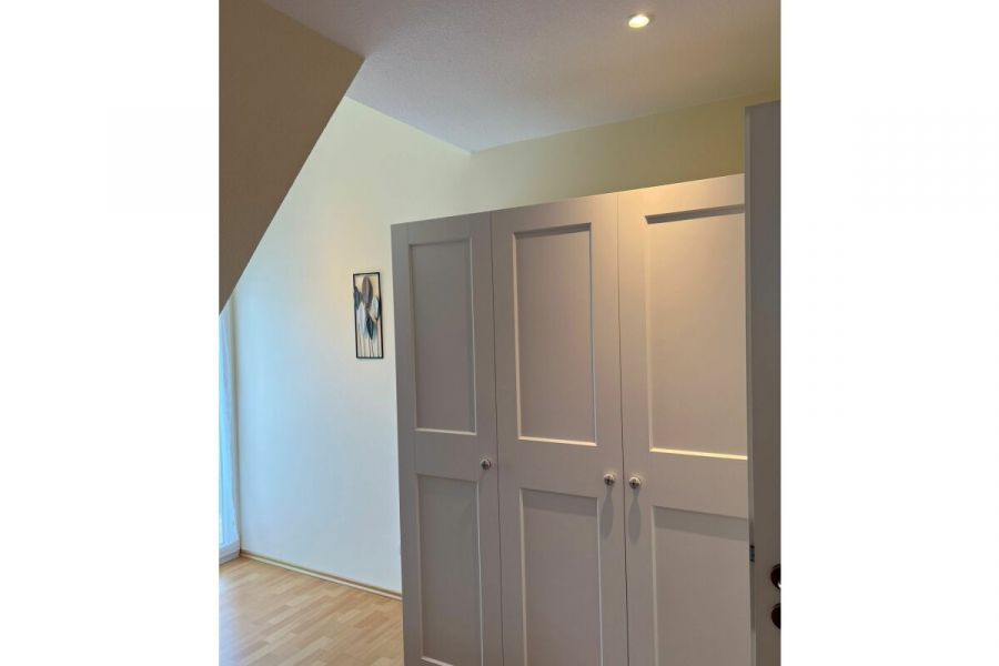 Die Wohnung ist in 2022 komplett neu renoviert worden und beherbergt in der ersten Etage, zwei Schlafzimmer. Diese sind jeweils mit einem großen Boxspringbett und einem TV- Gerät ausgestattet. Besonders hervorhebend ist hier, dass eines der zwei Schlafzimmer, ein eigenes Badezimmer mit Wellnessdusche und einem begehbaren Kleiderschrank verfügt. Von beiden Schlafzimmern aus, gelangen Sie auf den Balkon, der Ihnen einen einzigartigen Blick, auf den Hafen von Carolinensiel bietet. Für das Mobile Arbeiten im Urlaub oder dem Besuch der ganzen Familie, steht ein Büro und ein zweites Badezimmer mit Dusche, zur Verfügung. Das Schmuckstück der Wohnung, ist der Wohn- und Essbereich, mit offener Küche. Hier können Sie sich bei angestellter Fußbodenheizung oder am schönem Kaminofen, entspannen. Die Küche ist mit einer Spülmaschine, einer Mikrowelle und allem weiteren Utensilien eingerichtet, was man zur Bewältigung des Alltages benötigt. Vom Wohnbereich, der natürlich auch mit einem großen TV-Gerät ausgestattet ist, gelangen Sie auf den zweiten Balkon, der den Blick auf den Hinterhof des Hauses bietet. Der ausgebaute Spitzboden bietet Ihnen einen kleinen Ruhebereich mit bequemen Möbeln und ein Boxspringbett für zwei weitere Personen.