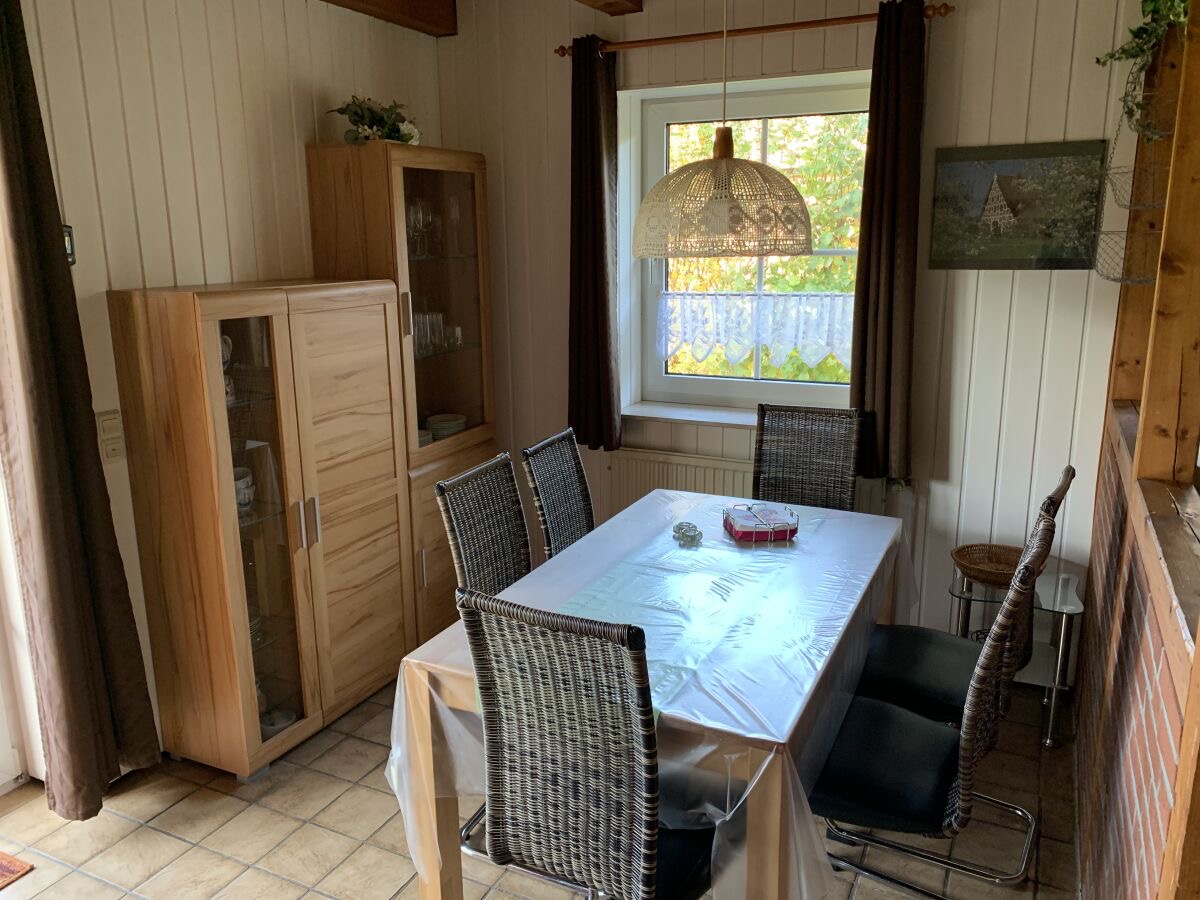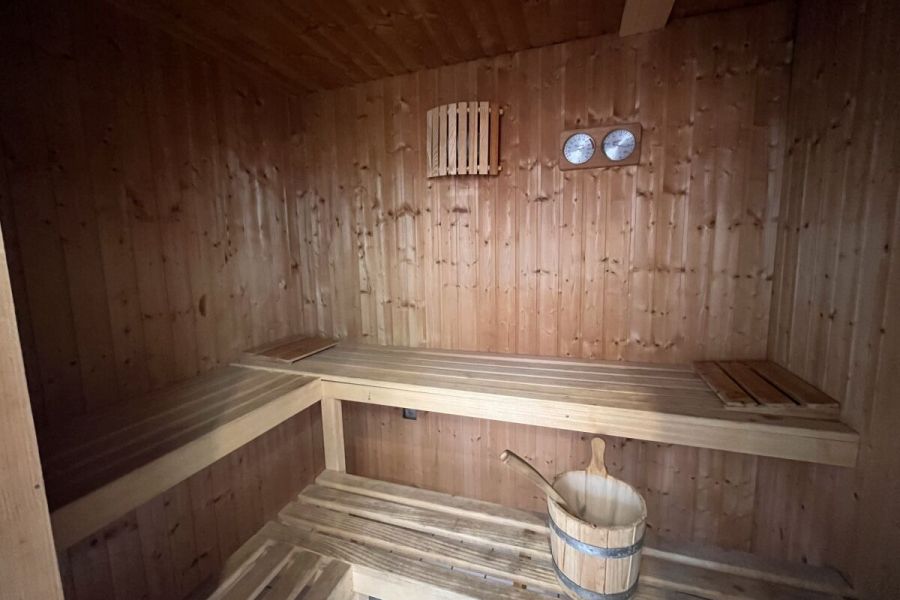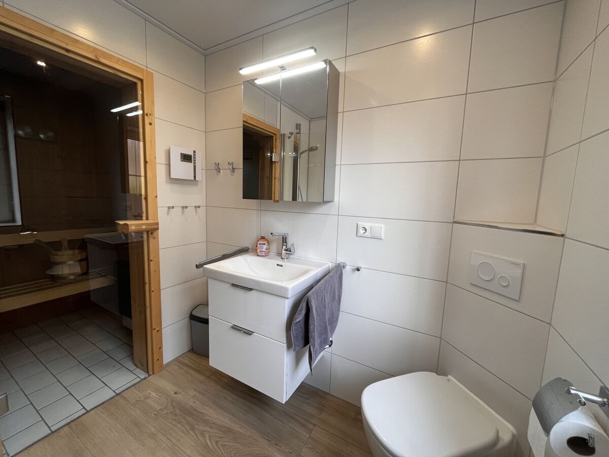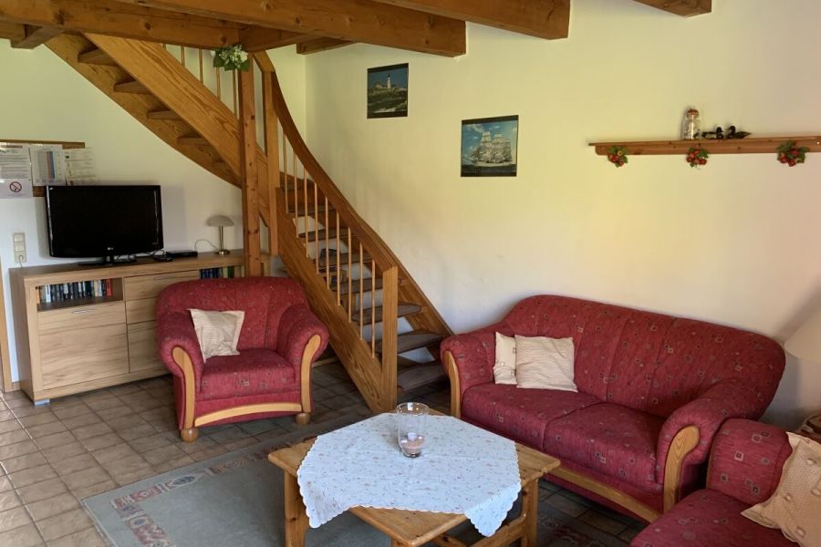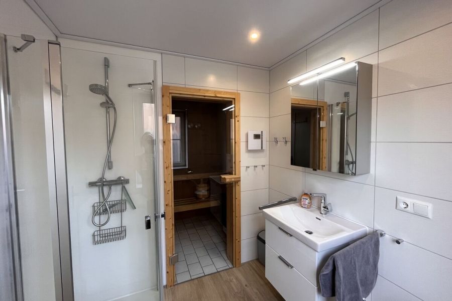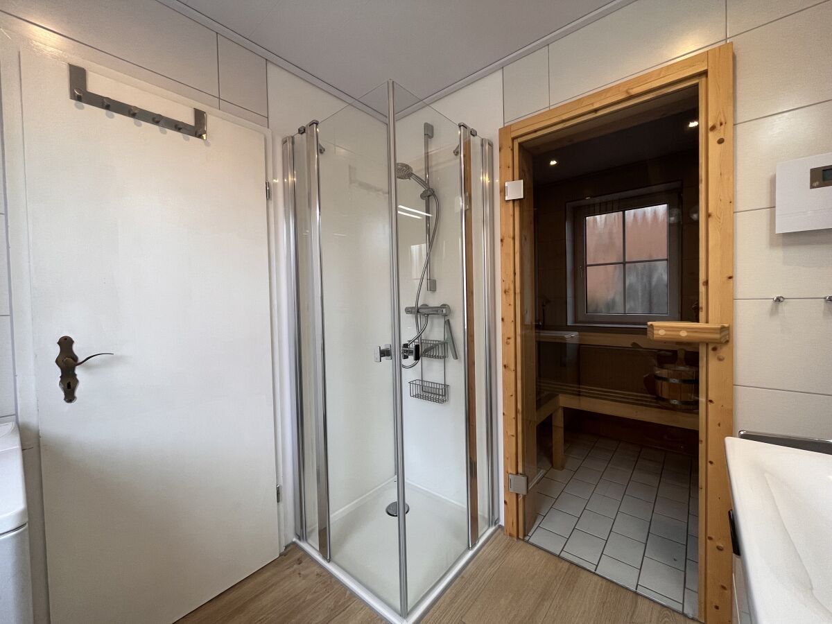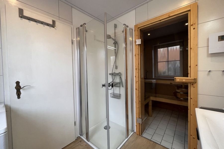 Im unteren Bereich befindet sich der Wohn-und Essbereich mit anliegender gut ausgestatteter Küchenzeile. Weiter Im Erdgeschoss befindet sich ein Badezimmer mit Dusche und Waschmaschine sowie ein Schlafzimmer mit einem Hochbett. Zwei weitere Schlafräume, eines mit Doppelbett und eines mit zwei Einzelbetten, sowie ein Kinderreisebett und ein Gäste-WC sind in der 1.Etage. Highlight ist die Hauseigene Sauna.